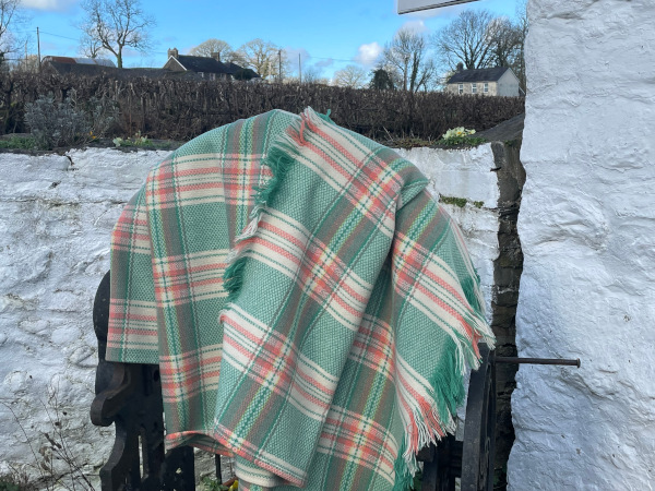 WELSH FRINGED BLANKET IN GREEN WITH PINK AND CREAM