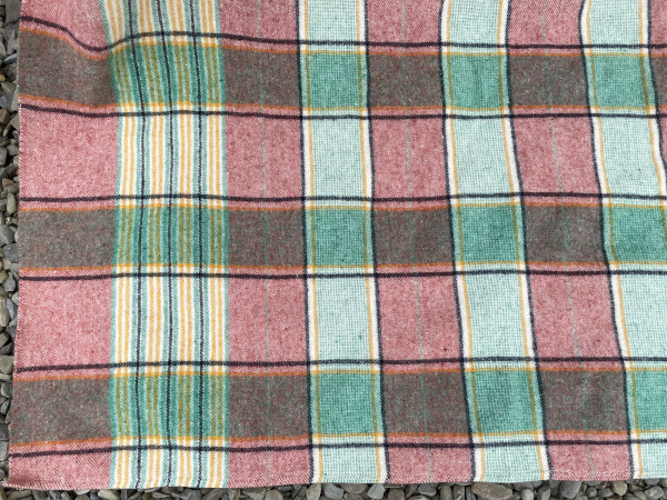 Beautiful narrow loom plaid in a tan/red with green, cream, yellow and black.